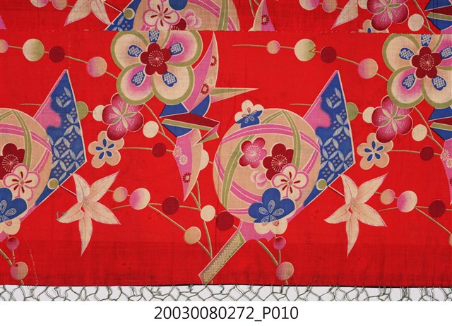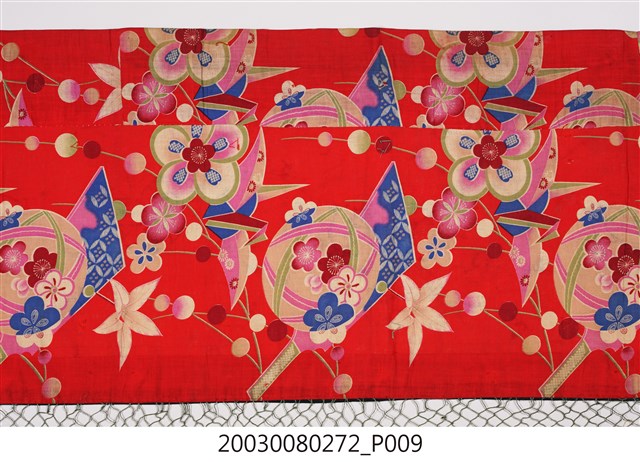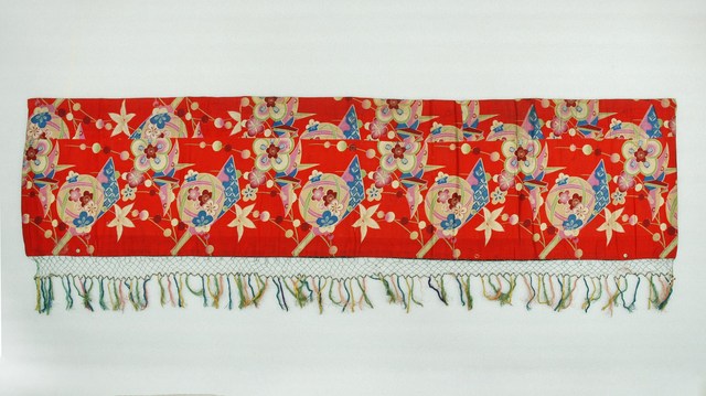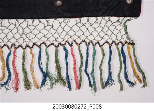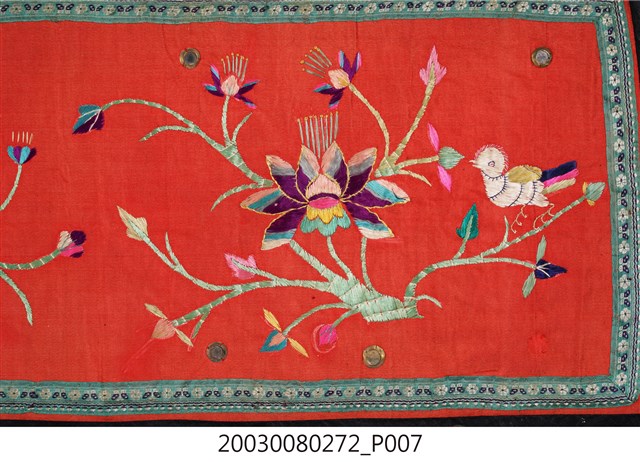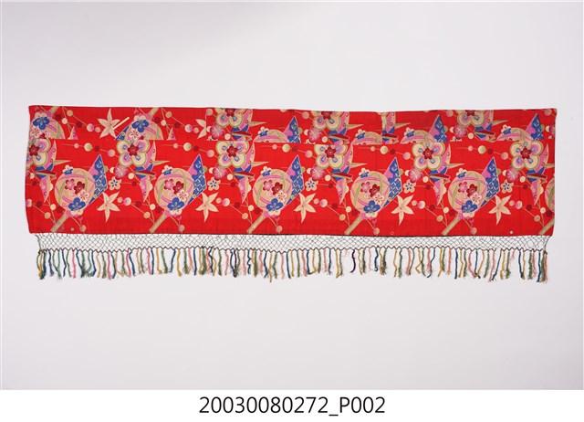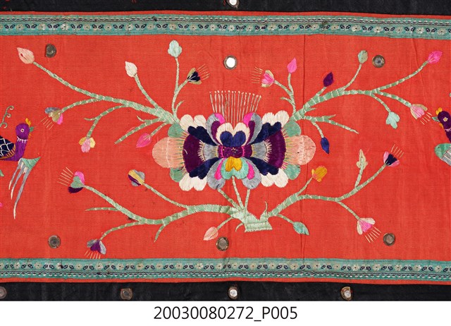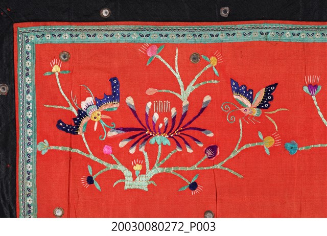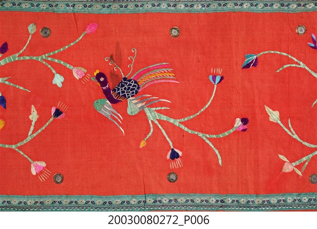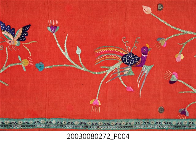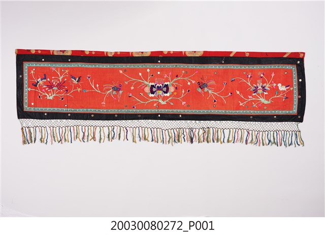1. 本件帳簾是單一圖框,外圍有一層的綠底花紋布,最外層則是一層黑布。圖案以橘布為底,繡有花卉蝴蝶以及「雙鳳牡丹」圖樣。下擺是五色網狀流蘇,整件有小圓鏡作為點綴裝飾。背面是拼接的合成花卉布料。2. 本件的「雙鳳牡丹」圖案,繡有牡丹、梅花跟其他枝葉,並間以鳳鳥棲枝,象徵富貴吉祥。