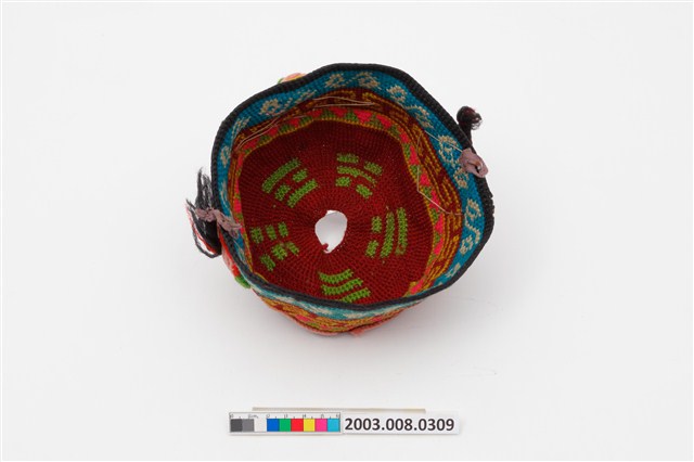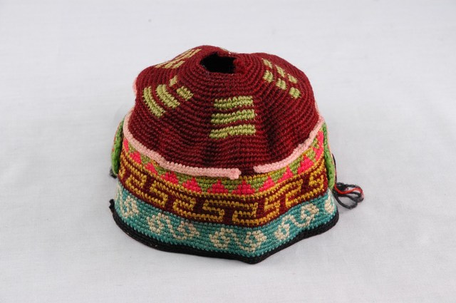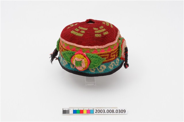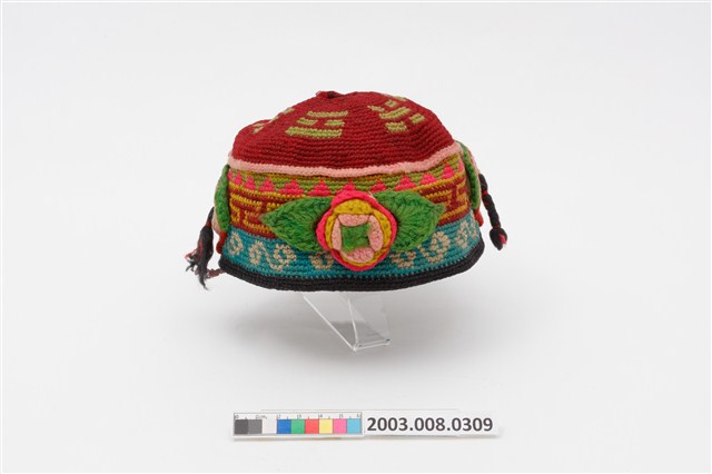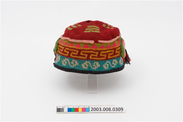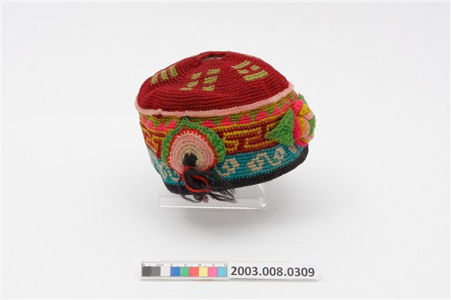 1. 彩色毛線編織碗帽,帽頂為磚紅色,並織有5個草綠色八卦掛文,正中央收合處留有一小圓孔。帽身側邊以藍、米、紅、黃、綠、桃紅等多色毛線編織浮雲、盤長、三角形等幾何紋樣。帽子正前方綴一立體毛線花朵,其左右兩側綴粉紅、紅、綠三色毛線編織成之桃形片,中央綴黑色麻花辮裝飾,但一側已散開。帽底緣以黑色毛線邊織收邊。2. 碗帽形狀如倒扣的碗,罩在頭上以保護頭部。