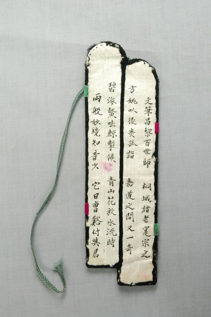 本文物為置筆用具,布料刺繡製品,正面為黑色布料,分為上下二管狀,上方繡有禽鳥、蓮花、蘭花等花卉圖案,邊緣金線刺繡。背面為淺色布料,書法題字有「文筆昌黎百世師 桐城諸老寔宗之 方姚以後無孤詣 嘉道之間又一奇 碧海鰲呿鯨掣候 青山花放水流時 兩般妙境知音少 他日曹谿付興君」,下方有一掛繩。