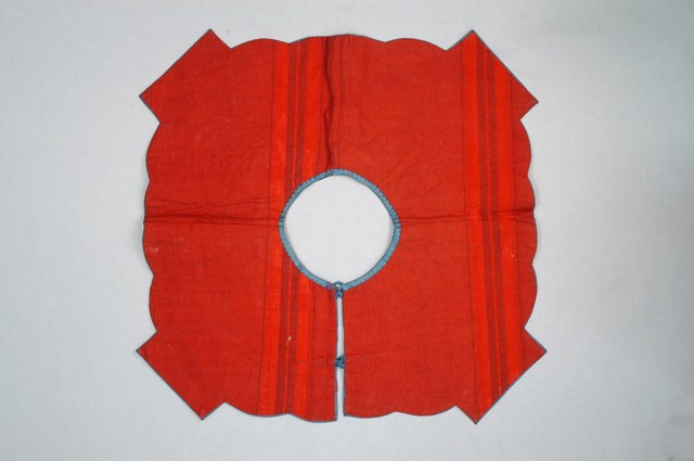 1.此件雲肩底布為紅色,以四片瓶型布拼接而成,並以棗紅色線在連接處加固。使用藍色綢緞包邊。以米色綢緞做貼布挖雲。雲肩開口處有藍色繫繩,用以固定、調整鬆緊。裝飾技法方面,均用五色線以緞面繡繡有纏枝花卉紋,並妝點蝴蝶紋。纏枝花卉寓意富貴,搭配瓶型底布,有平安富貴之意,蝴蝶紋則表示福氣,此件雲肩包含富貴平安的美好祝願。2. 此件文物購自林漢章先生,雲肩為早期先民常使用的生活織品,屬於孩童與女性的服飾,具有裝飾功能之外,還可防止髒污沾染到衣服。