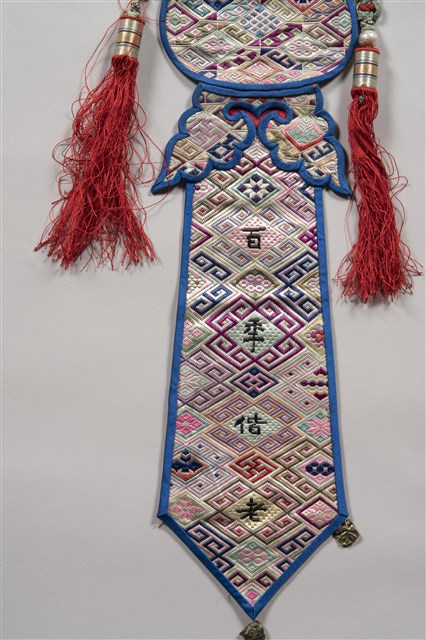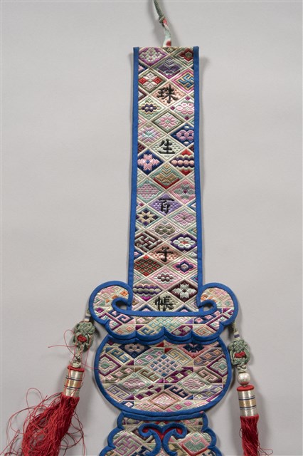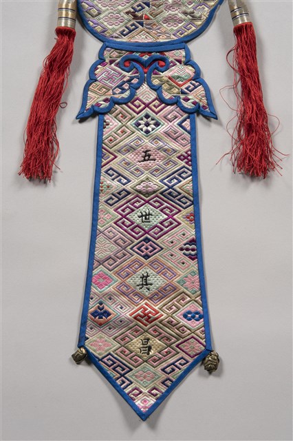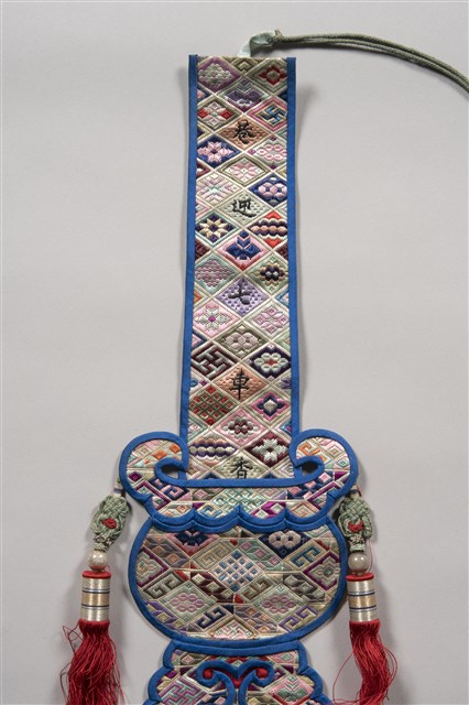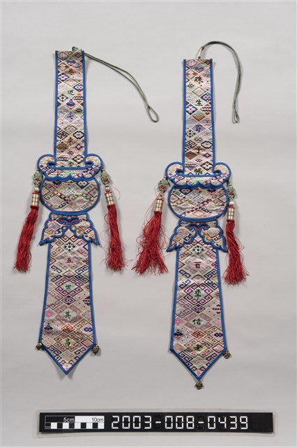 此對劍帶背面以米白色絲緞製作底布(正面被納紗滿繡蓋住無法辨識),緣邊以藍色棉布鑲緄,帶身分成三段,上下二段是普通劍帶形式,中間部份做成香爐造型,香爐下面有相對稱的如意雲紋裝飾,周邊均以藍色棉布鑲緄,使圖案輪廓更加明顯突出。香爐兩旁垂飾紅色絲穗流蘇和銀珠、結飾。劍帶內部以各色絲線搭配納紗滿繡技法繡出許多圖紋,有各式幾何圖案、卍字紋、雙錢紋、盤長紋、八角花、回紋等等,劍帶上、下各有成對的詩句:上端是「珠生百子帳、巷迎七車香」,下端是「百季偕老、五世其昌」,在許多細小圖紋襯托下,形成注目的焦點。刺繡技法中使用垂直針搭配數布紗格眼的方式,在紗格之間刺繡圖案者稱為「納紗」(與數紗技法類似,納紗者布料格眼較疏而明顯),刺繡圖案空留部份紗地者稱為「戳紗」,如果將整個布面滿繡不留紗地者稱為「納繡」。