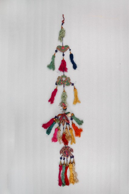 1.本件最頂端為淺綠結穗,下方為蝙蝠型飾布。下方再墜有三色結穗,桃紅結穗墜有牡丹型飾布,飾布下方墜有三色結穗,綠色結穗墜有內填棉花的花型拼布,下方墜有九色結穗,下方有內填棉花的錦雞型飾布,下方有五色盤長結穗。蝙蝠諧音福,錦雞象徵吉祥,牡丹寓意富貴,而盤長結則表示富貴,故此掛飾寓意富貴吉祥與福氣無窮無盡。本件的飾布均為兩面不同色,一面橘色一面綠色,可增加變化感。2. 此件文物購自林漢章先生。此種掛飾用於裝飾居家環境,多以吉祥紋樣為主,並墜有結穗、流蘇,十分華麗。