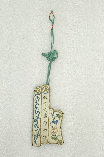 本文物為置筆用具,布料刺繡製品,淺藍綠色,為一書卷造型,繪有藤蔓圖案,書寫文字「須知一刻值千金」,繡有花卉。背面為米白色,繡有藤蔓圖案,書寫文字「欲借六書傳四海」,繡有花卉,邊緣金色刺繡。有一掛繩。