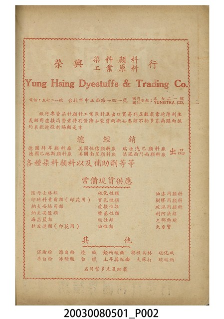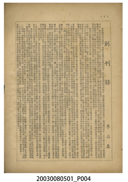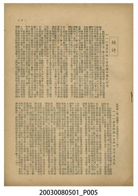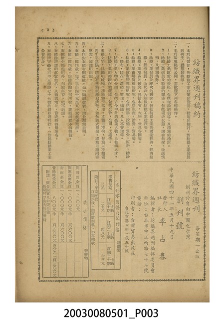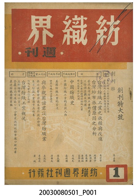 本物件為紡織界週刊創刊特大號,封面以米色為底,上以黃紅色塊由右而左書「紡織界.週刊.」中間米色底有紡織機浮水印,上為目錄如下:「創刊辭-李占春(按:李占春為該刊社長);短評:發展紡織工業與增加國民所得、發展紡織工業與加強保護政策;專論:台灣紡識工業之扶植與改進-束雲章、台灣紗布漲價原因之分析-趙潤予、發展本省紡織工業的展望-張潤蒼、泛論保護與反保護-羅敦偉、台灣工業化與保護紡織工業-魯鎮湘、開放棉布進口問題-呂夢蕉;中國紡織界:中國紡織史-高越天、中國紡織工業的草創人物-屈伏櫪;世界紡織界:美國紡織工業的發達-羅長闓、世界紡織品消費情況-梁偉成;紡織工業參觀團座談會:與參觀團諸君談台灣紡織業-石鳳翔、與座談會諸君談本省針織品外銷-李積慶、本省紡織工業進步在那裏-蕭城、紡織工業座談會紀錄;資料:台灣紡織工業概況、反對棉布進口宣言、答覆台北市進出口商公會建議開放棉布進口理由書、最近紡織要聞彙編。」;封面最下方有黃色橫條色塊上印「1(以白底紅正方圈之)」及「.紡織界週刊社發行.」