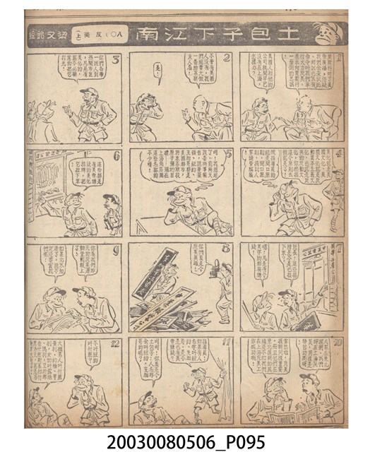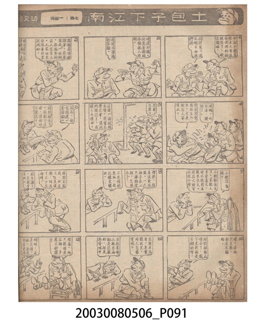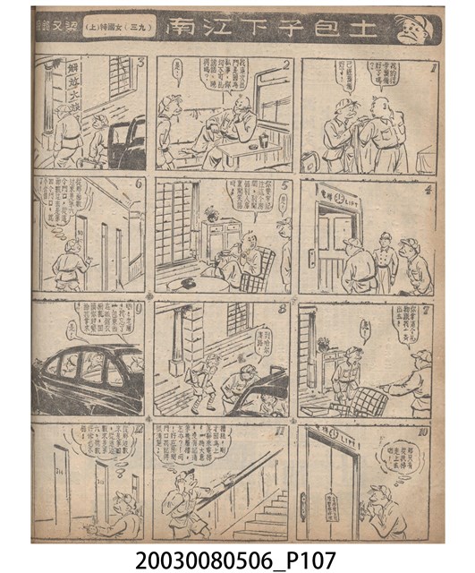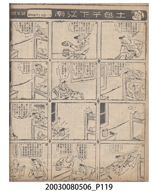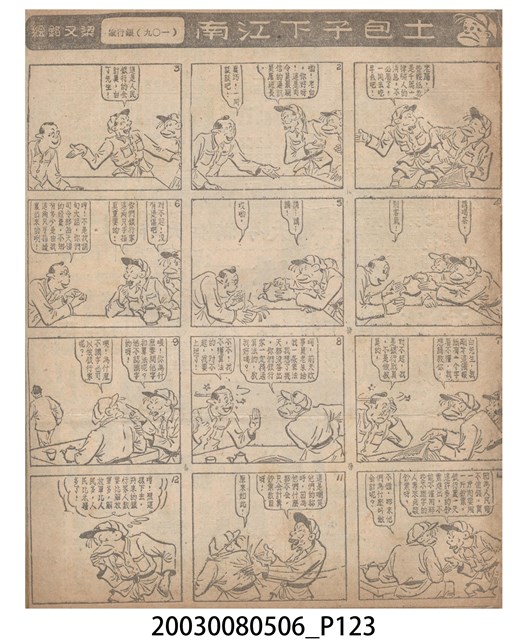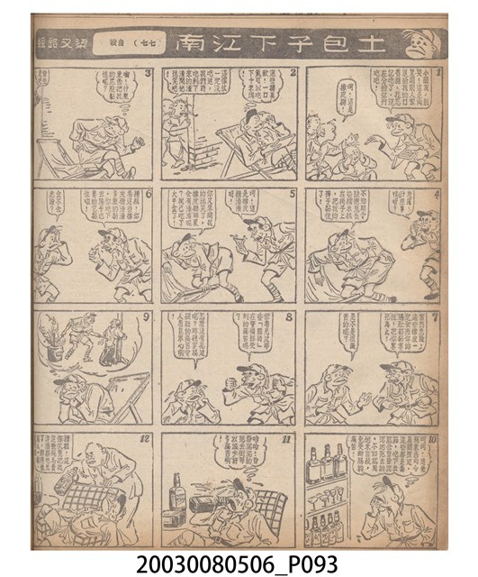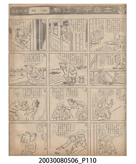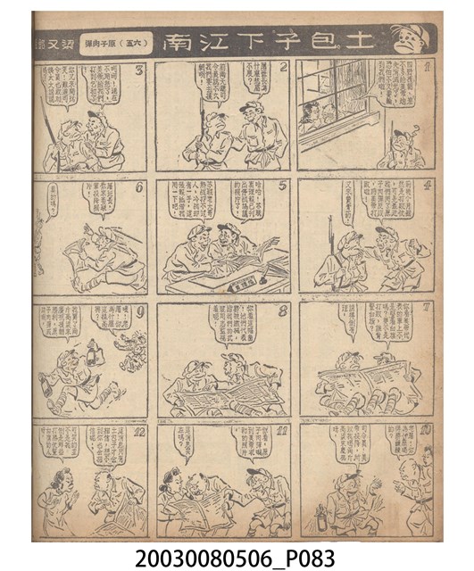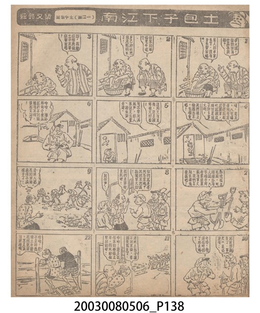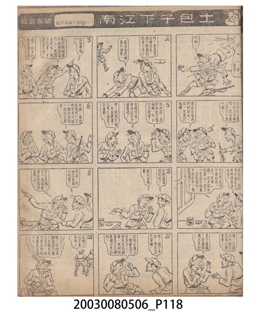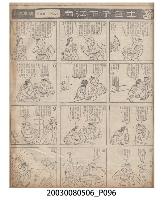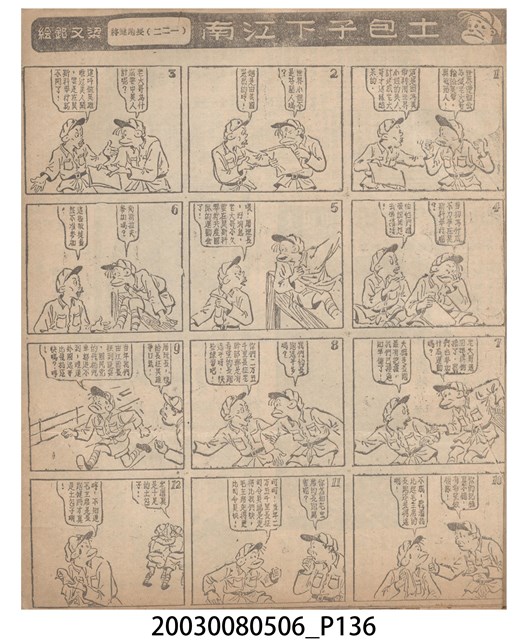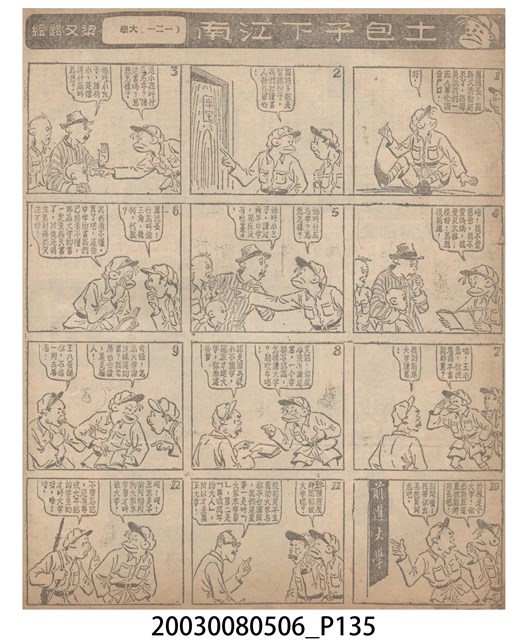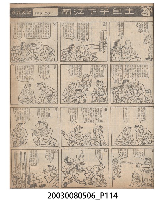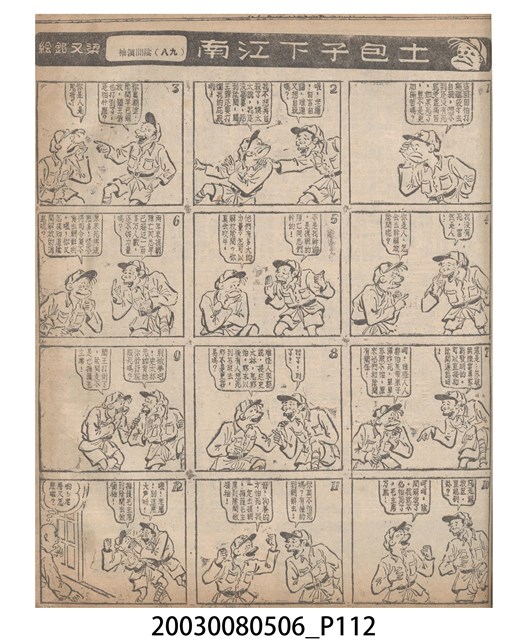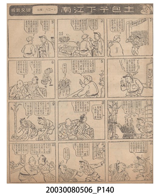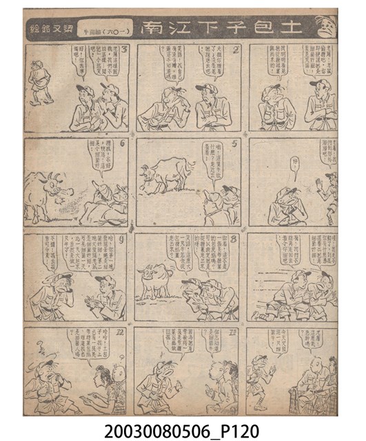 1.臺灣漫畫《土包子下江南》在臺連載中文四個連環漫畫剪貼簿封底,直行偏正方形規格,使用牛皮紙色的封面,中間一行長方形印刷「土包子下江南」,這行字上方還有土包子的插畫,右邊則穿兩個孔並用深綠色棉線成冊。海報右邊則磨損較為嚴重,上下方也有髒污捲起,整體多有灰塵。2.《土包子下江南》於1949年開始於《圖畫時報》連載,與他的胞弟梁中銘一起,隔年應《中央日報》之邀,將《圖畫時報》併入《中央日報》,編輯成「漫畫半周刊」,後來梁中銘蒐集自己多幅的反共漫畫,在1954年出版《中銘漫畫集》。連載約8年之久。為臺灣當代重要的漫畫家。主要描繪反共、軍事等相關題材。