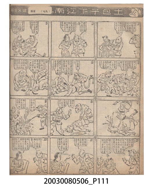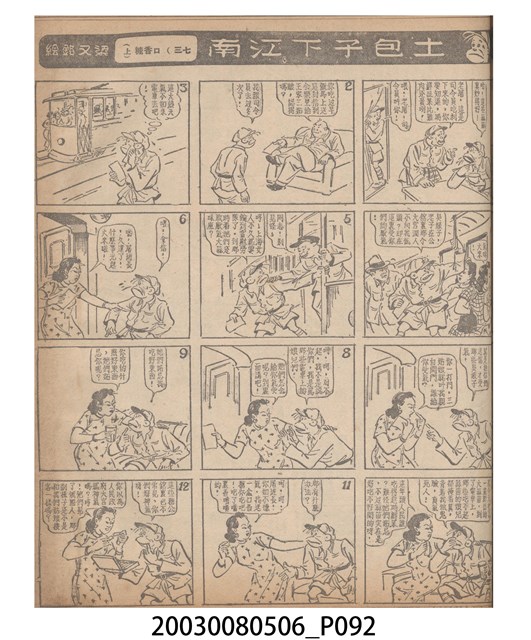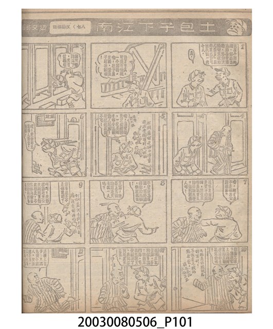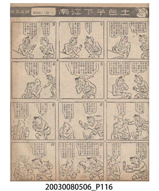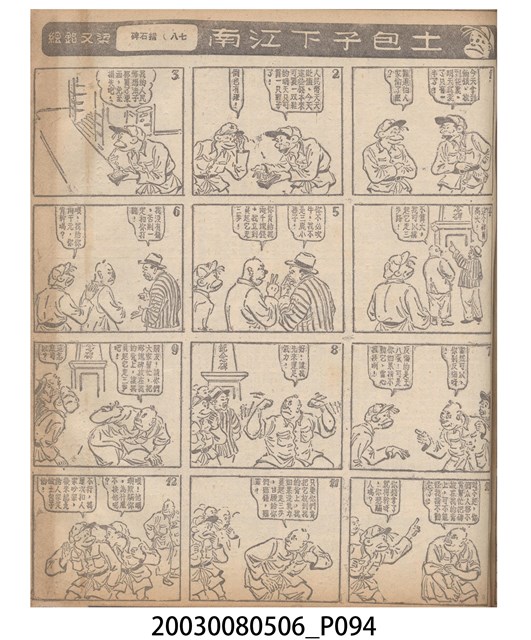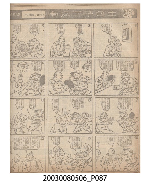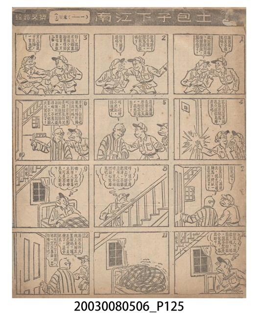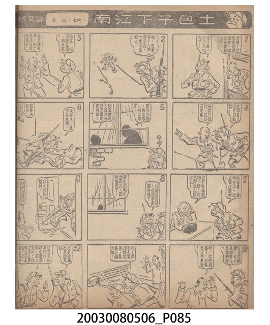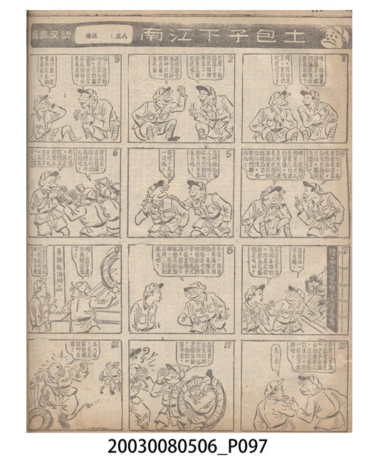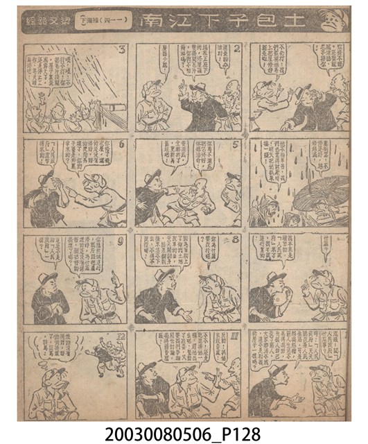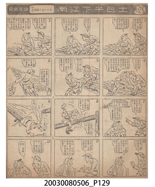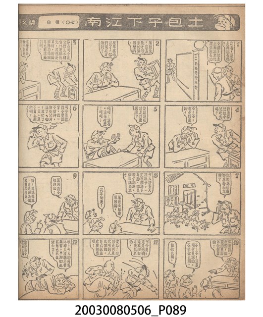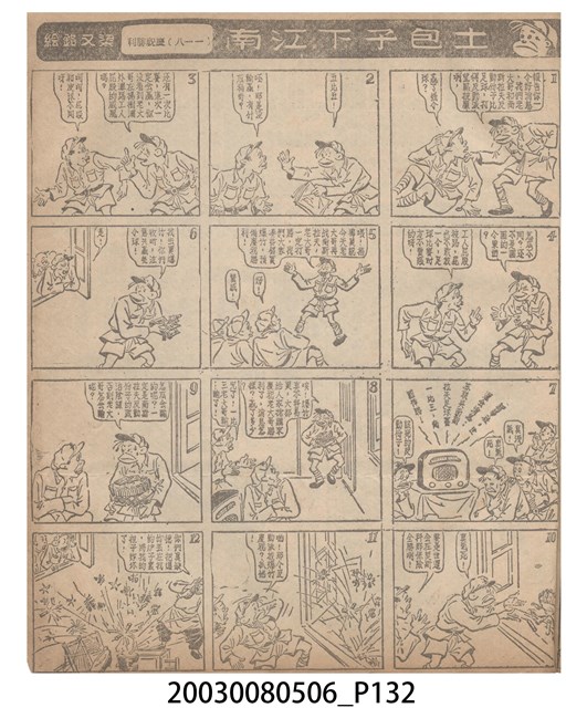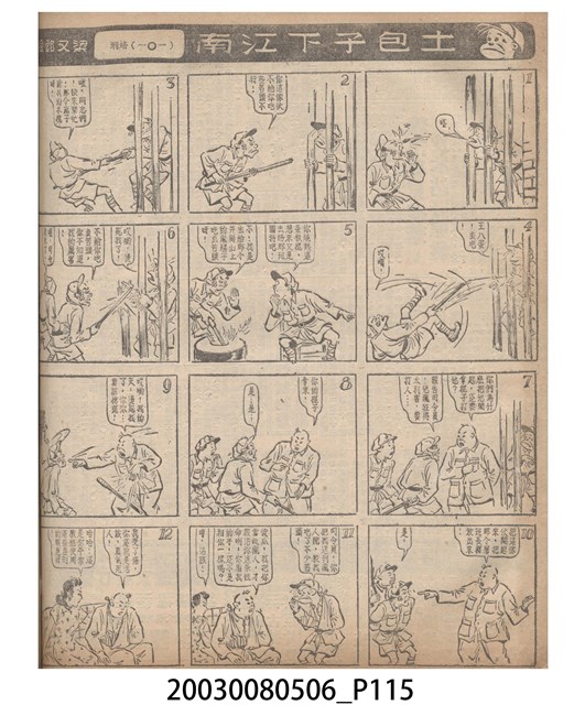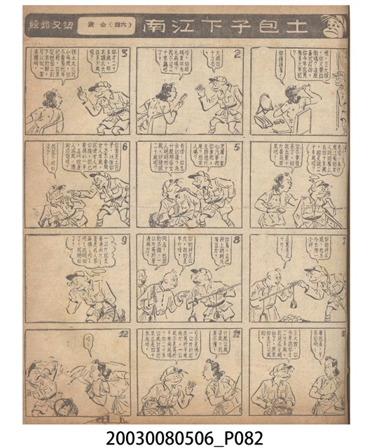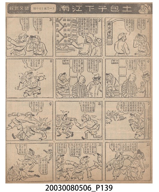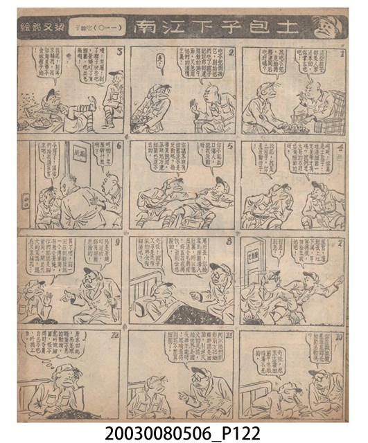 1.臺灣漫畫《土包子下江南》在臺連載中文四個連環漫畫剪貼簿封底,直行偏正方形規格,使用牛皮紙色的封面,中間一行長方形印刷「土包子下江南」,這行字上方還有土包子的插畫,右邊則穿兩個孔並用深綠色棉線成冊。海報右邊則磨損較為嚴重,上下方也有髒污捲起,整體多有灰塵。2.《土包子下江南》於1949年開始於《圖畫時報》連載,與他的胞弟梁中銘一起,隔年應《中央日報》之邀,將《圖畫時報》併入《中央日報》,編輯成「漫畫半周刊」,後來梁中銘蒐集自己多幅的反共漫畫,在1954年出版《中銘漫畫集》。連載約8年之久。為臺灣當代重要的漫畫家。主要描繪反共、軍事等相關題材。