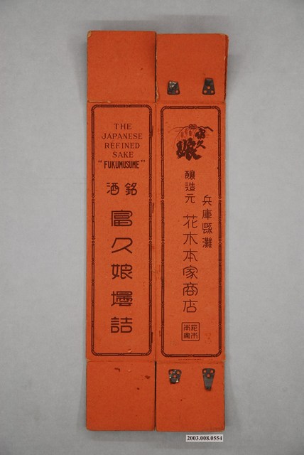 1.本文物為臺灣總督府專賣局賣銘酒富久娘曇詰包裝,其整體呈橘色,上面有相關資訊,如「西日本 優等銘酒 富久娘 臺灣總督府專賣局發賣 兵庫縣攤 花木本家商店 吟釀」等。「富久娘」是指「富久娘酒造株式會社」,其於天和元年(1681)年起家,其營業項目有清酒、燒酌、味琳、洋酒等項目。