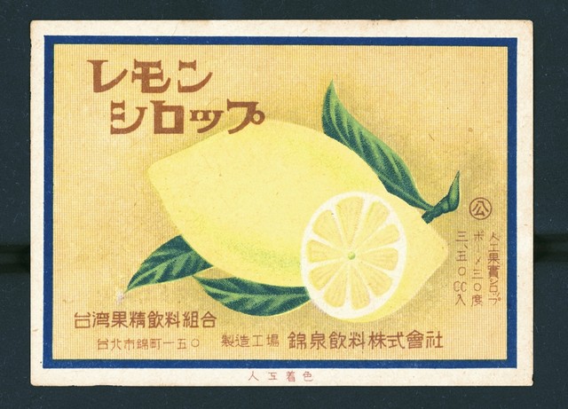 本物件為錦泉飲料株式會社檸檬糖漿商標紙,中有一檸檬圖示,上方レモンシロップ即為檸檬糖漿,標明「人工果實シロッぷボ―メ三○度三、五○CC入」,說明該檸檬糖漿的成分使用波美30度3.5CC的人工果實糖漿。下方寫有「台灣果精飲料組合」,地址位於「台北市錦町一五○」,製造工廠為「錦泉飲料株式會社」。
