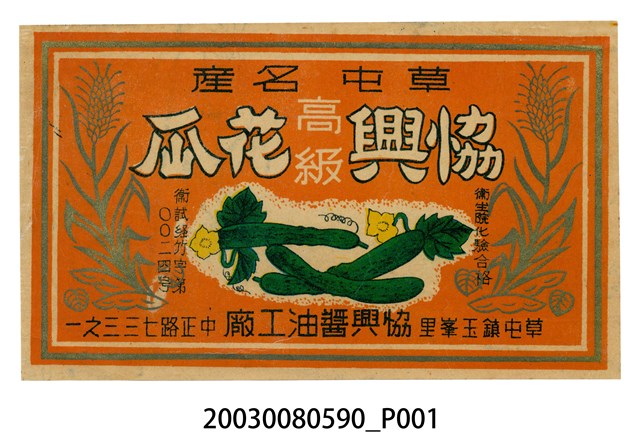 1.此物件為南投草屯協興花瓜罐頭商標紙,上方寫有「草屯名產」字樣。中有花瓜圖樣,標明經「衛生院化驗合格,衛試經竹字第○○二四号」由協興醬油工廠製造,位於草屯鎮玉峯里中正路七三三之一。