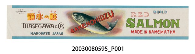本物件是彩色商標廣告1張。商標右側印有紅字「RED」、藍字「BOILD」、綠字「SALMON」、紅字「MADE IN KAMCHATKA」;商標中央繪有1隻鮭魚圖樣,魚身上印有紅字「SAKENOHIDZU」;商標左側印有「NET CONTEN TS 12.OZ.」、黃字「頭氷の鮭」、「T.HASEGAWA&?」、「HAKODATE JAPAN」文字。
