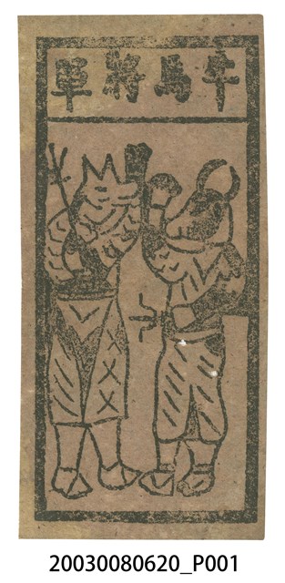 本件牛馬紙錢採直幅構圖,以單一墨色印製在鵝黃色的草紙之上,上端框內橫書「牛馬將軍」四字。下方框內並立兩位作獸首人身、著鎧甲的武將,右側為牛將軍,作牛頭人身,右手上舉,左手橫握一把三叉戟。左側為馬將軍,作馬頭人身,左手上舉,右手握一把大刀。