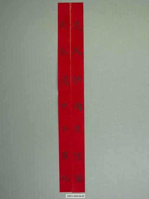 本件手書符令在大紅色長條形紙張上以書法書寫,符令上端為「勅令」、「VVV」,接著為十一個由複合式文字所組成的道教神祇秘諱,主要有玉皇大帝、雷聲普化天尊、太乙救苦天尊等。符令的背後書有兩行文字:「先天秘內定陰陽,太極圖中分造化。」說明此符令具有分陰陽、定造化的強大法力,可以護身、鎮宅與驅邪、押煞。