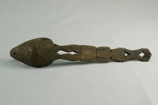 1. 臺灣原住民木雕湯匙,購藏來源地與製造者不詳,依據湯匙型制與柄部雕刻圖紋判斷,推測為排灣族之器物。