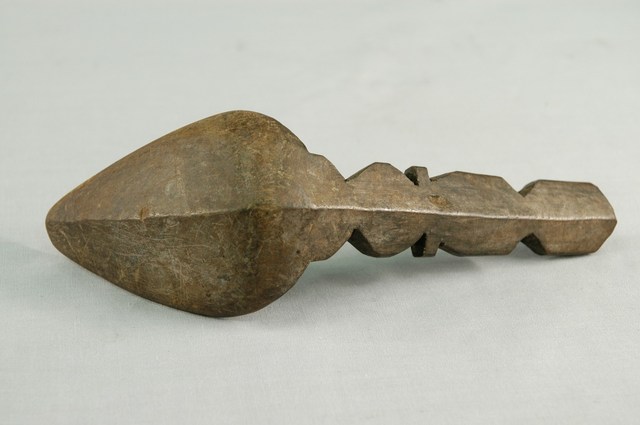 3. 木匙於排灣語稱為kizing,為日常生活用具,大木匙通常用來勺酒或勺水,小木匙多用來勺湯,本件屬小型。排灣族木匙多選用月橘或大葉黃楊等質地較軟且光潔細緻、便於修整雕刻之木料製作。傳統排灣族屬階級社會,頭目與貴族階級享有裝飾權,因此雕刻人頭、人像、百步蛇紋等裝飾圖紋之木匙,通常為貴族家中所使用之食具。