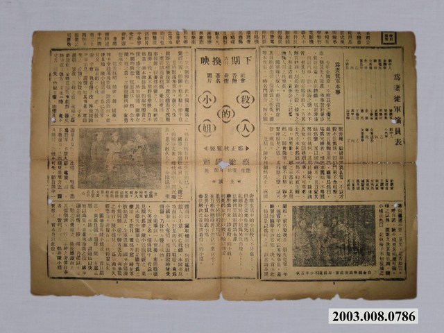 1.本物件為新世界戲院為「為妻從軍」之宣傳海報,紙質文物。該物件正面設計主要由文字及插畫組成,主要語言為中文。左上方可見「新世界戲院」,左半部主要為「為妻從軍」宣傳廣告,中間附有一位男性及一位女性的插圖,並以中文書寫「為妻從軍」。物件中間為明星公司出品之「恨海」廣告,右半部主要為為妻從軍劇情敘述。右下方為現代影戲有限公司出版之「血濺荒堡」廣告,主演為黃雨亭、黃漫梨。物件背面右方為「為妻從軍演員表」。