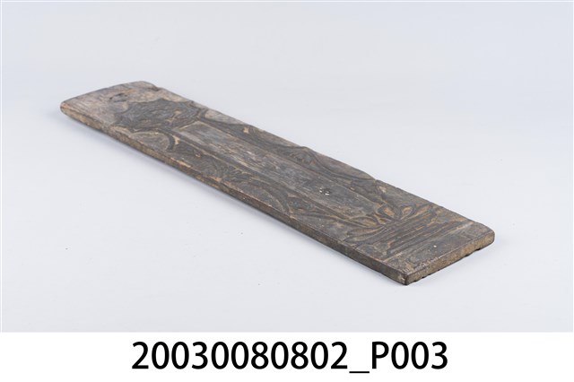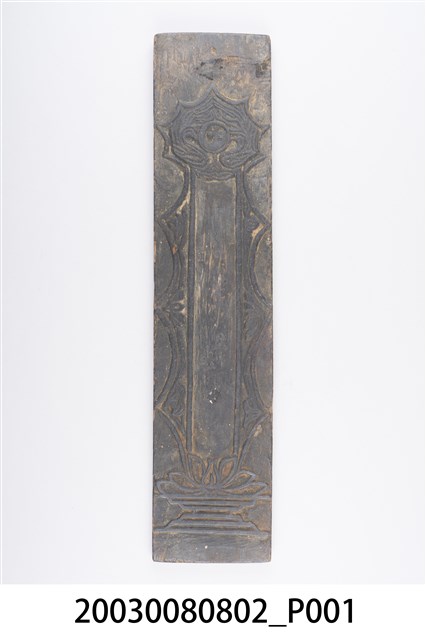 1. 木刻版畫的印版,一組兩件。2. 其中一件有蓮花之圖案;另一件圖像中有太極以及蓮花座,木板的狀態大多完整,四周有較明顯磨損情形。