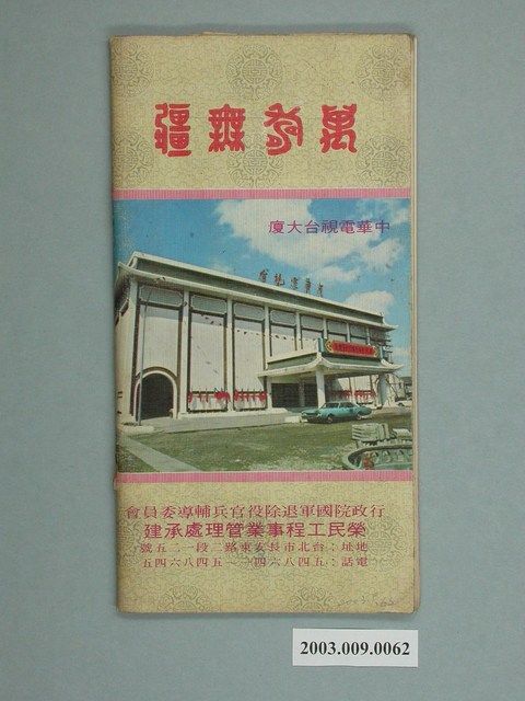 本物件為中華電視週刊第1期,發行人為劉先雲,發行所為中華電視週刊社,出版日期為民國六十年十月三十一日。封面上方為黃底,左方印「華視」、「CTS」,右方印「恭祝總統萬壽無疆」,下方印「中華民國六十年十月卅一日出版」、「中華電視週刊 C.T.SWEEKLY」。封面主體則為四名穿著旗袍,分立於臺階上的女子,為華視之播報員,右下方有一紅底白框「1」。背面為中華電視台大廈照片,照片上方印「萬壽無疆」,照片下方印「行政院國軍退除役官兵輔導委員會」、「榮民工程事業管理處承建」及地址、電話。本期目錄計有「全國電視台節目索引」、「千言萬語,只是一個服務」等20則報導及華視列車相關資訊,計108頁。