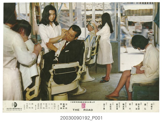 臺灣電影《路》彩色印刷劇照,僑聯彩色印刷公司印製。劇照為在理髮店裡,一男子正坐椅上給一白衣女理髮師掏耳朵的模樣。