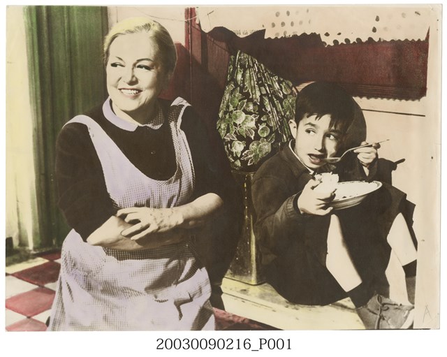 西班牙電影《不如歸續集》在臺灣發行的手繪上色劇照,照片為廚房場景,左側為飾演女傭的西班牙女星伊莎貝葛瑞絲(Isabel Garcés),而右方則為小男童星Cesáreo Quezadas(Pulgarcito)正吃飯的模樣。