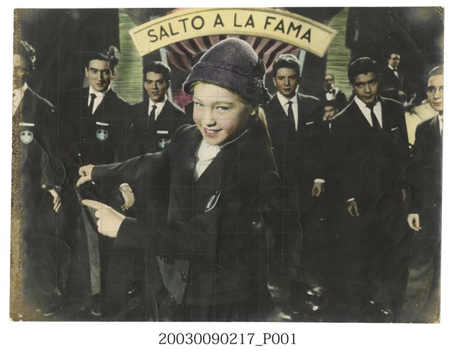 西班牙電影《不如歸續集》在臺灣發行的手繪上色劇照,照片上為西班牙小女主角瑪麗莎(Marisol)正面帶微笑對著鏡頭載歌載舞的模樣,背後有多位年輕男子伴唱及伴舞,而背板上"SALTO A LA FAMA"等字樣,推測可能是電視歌曲競賽秀的場景。
