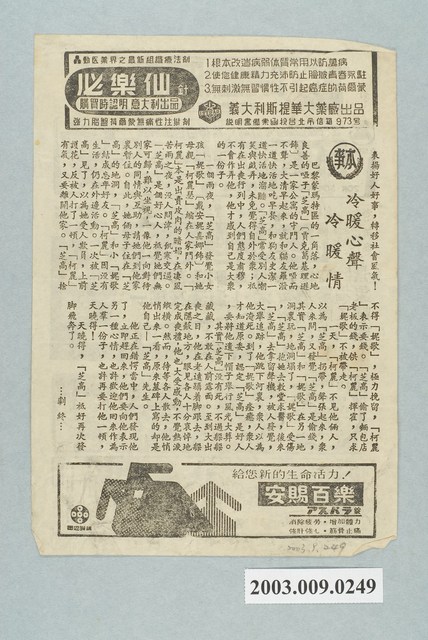 1.本物件為電影宣傳廣告,紙質文物。正面為黑白印刷,物件上方可見「國際戯(註:戲)院」字樣、「利保康」宣傳廣告,物件中間為「東德逃生記」宣傳廣告。下方為「安德民片」驅蟲藥宣傳廣告、「命力活片」宣傳廣告。物件背面上方為「必樂仙」宣傳廣告,中間為「冷暖心聲冷暖情」劇情介紹,可見「表揚好人好事 轉移社會風氣」標語。下方可見「安賜百樂」廣告。