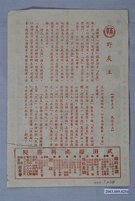 1.本物件為電影宣傳廣告,紙質文物。正面為黑白印刷,物件上方可見「兒童戯 (註:戲)院」字樣,物件中間為「香港 東京 夏威夷」宣傳廣告及其演員名稱列表。物件背面上方為「野灰王」劇情介紹,下方為「武田婦產科醫院」宣傳廣告。