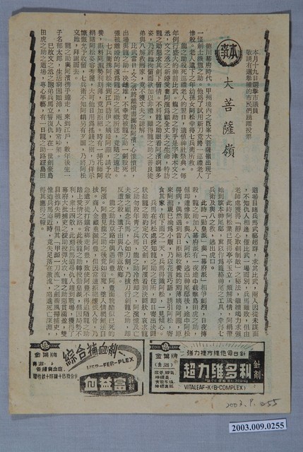 本物件為電影宣傳廣告,紙質文物。正面印刷為綠色,物件上方可見「第一劇場」字樣,物件中間為「杏苑情史」宣傳廣告及其演員名稱列表。下方為「味寶」廣告。物件背面上方為「大菩薩嶺」劇情介紹,可見「本月十九日選擧市議員 敬請有選擧權的市民們踴躍投票」宣傳標語。下方可見金葉牌的「血益富 綜合補血剂」、「超力維多利」廣告。