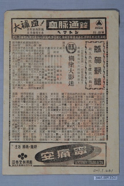 1.本物件為電影宣傳廣告,紙質文物。正面印刷為亮橘色,物件上方可見「新生」字樣,中間可見以中文書寫「多情公主」以及演員名稱列表。下方為「保女容膏」宣傳廣告。物件背面上方可見「血脉通」宣傳廣告,中間為「糊塗大影迷」劇情介紹,下方為回春堂製藥廠的「安痛寧」宣傳廣告。物件背面可見「一切要為復國 一切要為雪恥 處處要為反共抗俄着想」標語。