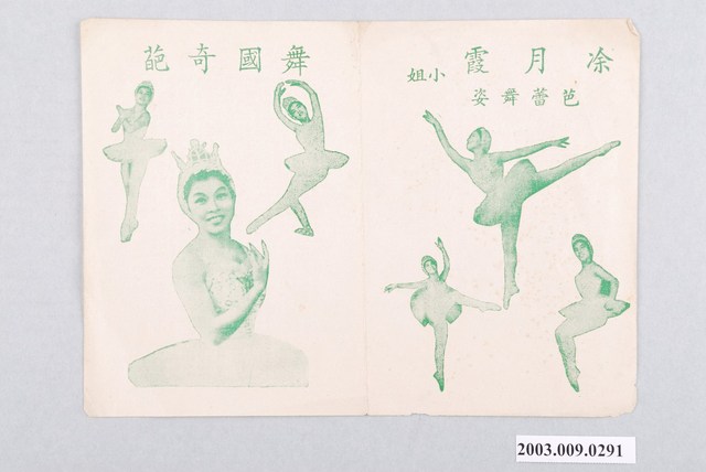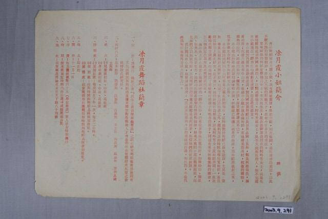本物件為凃月霞舞者簡介,為紙質文物,共有一張。正面可見該簡介底色為白色,印有「凃月霞小姐」、「芭蕾舞姿」、「舞國奇葩」,以及六張正在舞蹈的女性綠色剪影。背面右方為由「珊韻」所寫之「凃月霞小姐簡介」,左方為「凃月霞舞蹈社簡章」。凃月霞小姐簡介主要說明其學經歷,凃月霞舞蹈社簡章則主要說明「宗旨」、「教材內容」、「班次」、「特別班」、「報名」、「開學」、「學費」、「時間」、「地址」。