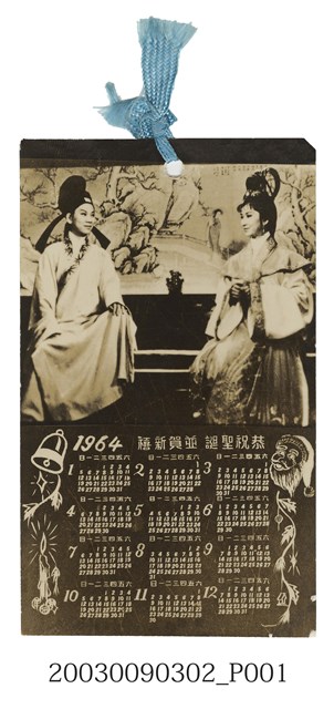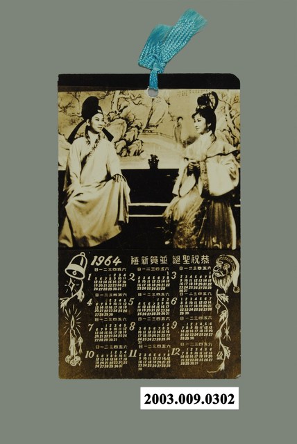 1964年《梁山伯與祝英台》(The Love Eterne)電影年曆書籤卡,單面印刷,並附加一藍色綁繩。上方為凌波及樂蒂分飾的梁山伯與祝英台劇照,下則是1964年年曆卡,文案由右至左:「恭祝聖誕,並賀新禧」。本件與登錄號2003.009.0488、2003.009.0489同為《梁山伯與祝英台》1964年電影年曆書籤,但劇照不同。