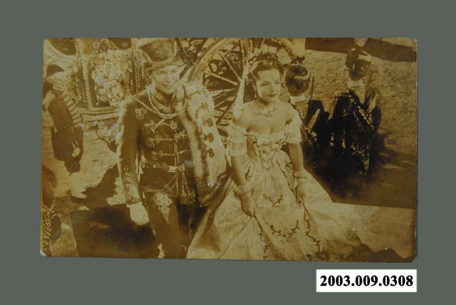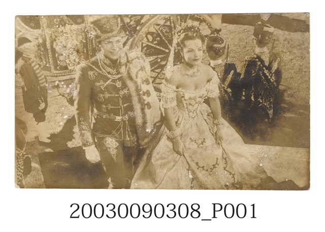 奧地利片《我愛西施續集》橫式黑白電影劇照,照片上為在室外結婚的豪華場景,前方是男主角卡爾波恩與女主角羅美雪妮黛二人身穿禮服望向前方,後方則另有馬車及站立士兵。