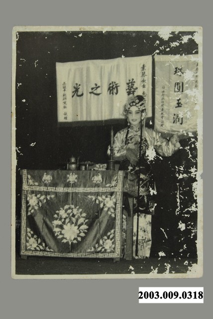 1.一名女旦角在舞臺上演出、粉墨登場的黑白照,背板上掛有兩幅喜幛:「素琴女士惠存:藝術之光。正誼平劇研究社敬贈」,以及「素琴女士惠存:珠圓玉潤。司法行政部同樂晚會敬贈」等字樣。司法行政部即今日的法務部。