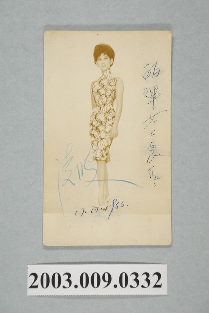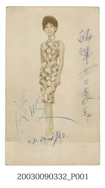 香港女明星凌波的黑白簽名照,本件上有凌波的簽名、題字「麗輝女士惠存」,以及註明日期:「11.10.1963」;背面另蓋印「沙龍攝影」、「九龍加連威老道四十六號」等藍色字樣。