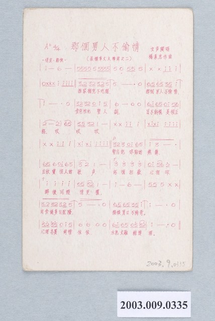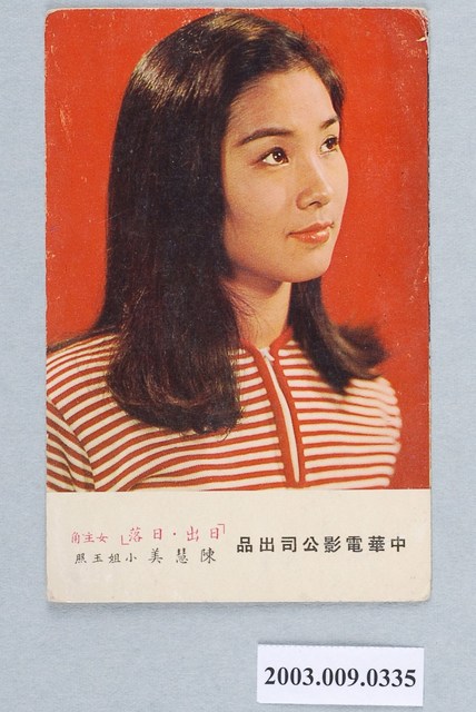 臺灣女明星陳慧美的彩色劇照,本件下方另標明「中華電影公司出品」、「『日出.日落』女主角,陳慧美小姐玉照」,另面則是楊秉忠作曲的〈那個男人不偷情〉之歌曲簡譜,而歌曲名稱之下則標有「最標準丈夫插曲之二」等字樣,《最標準的丈夫》亦為陳慧美於1967年主演的電影。