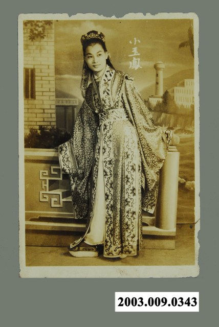 臺灣歌仔戲演員小玉鳳的黑白定裝照,衣著為小生裝扮,上有印刷「小玉鳳」白色文字。 小玉鳳曾組成「小玉鳳少女歌劇團」,巡迴全臺演出歌仔戲。