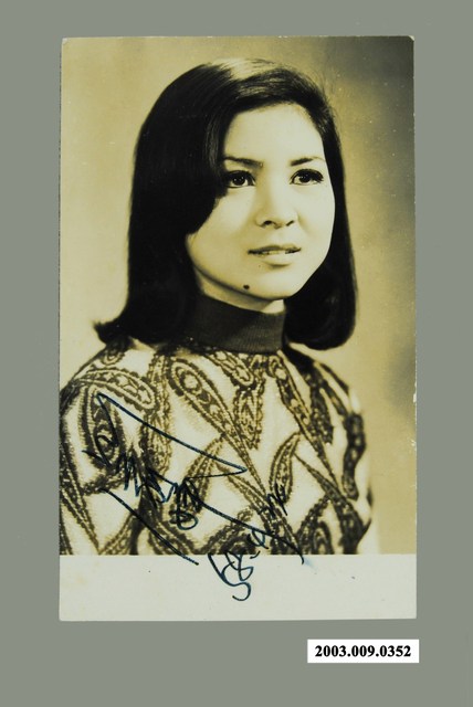 女明星黑白時裝照,上有簽名,字跡潦草難以辨識,並標寫日期「58.4.24」。