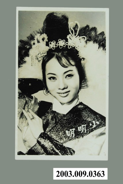 臺灣歌仔戲演員小明明女旦扮相的黑白定裝照,上有「小明明」三字。
