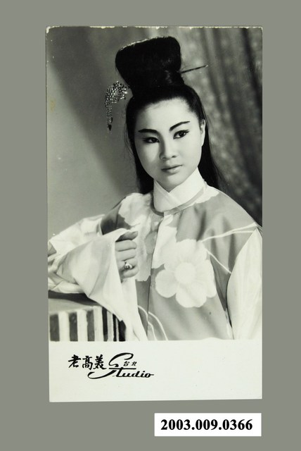 臺灣歌仔戲演員許秀年的黑白定裝照,上為許秀年扮女旦的個人照,下方則是「老高美Studio、台北」的字樣。