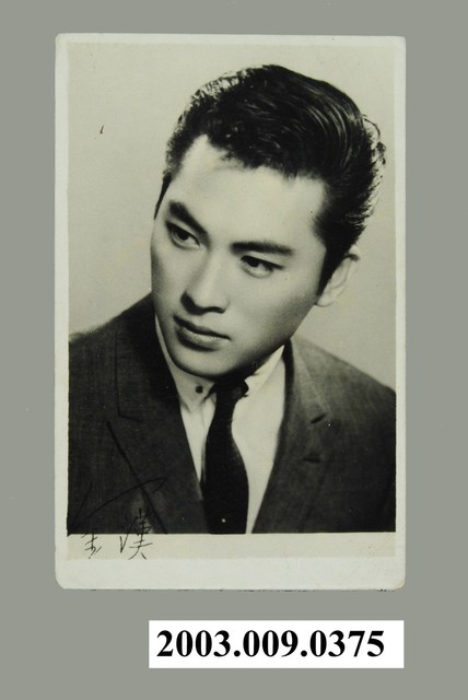 香港男演員金漢的黑白時裝照,上有其簽名。
