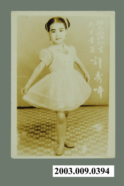 臺灣歌仔戲知名演員許秀年的童星幼年照,搭配「孤兒流浪記主角,天才童星許秀哖」字樣。