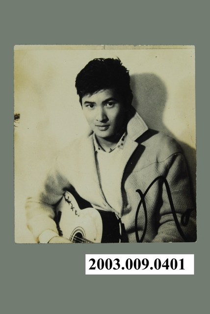 男明星拿著吉他的黑白時裝照,推測為日本男明星小林旭。 小林旭,為日本演員、歌手,活躍於1960、1970年代,曾以拿著吉他踏著夕陽流浪天涯的「候鳥系列」電影(《ギターを持った渡り鳥》、《渡り鳥いつまた帰る》...)大受歡迎。