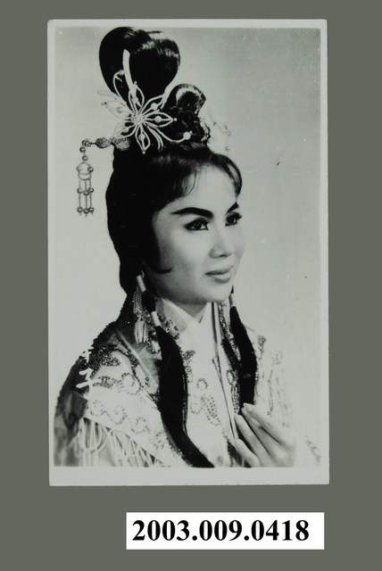 臺灣歌仔戲女演員扮小旦的黑白定裝照,左側寫有「□子」白色文字。