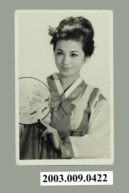臺語片知名女星金玫穿韓服妝扮的黑白照片。