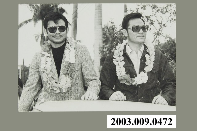 1.二位臺灣男明星站在車上遊行、脖戴花圈、眼戴墨鏡的黑白時裝合照,左為劉林,右為高鳴,二人在1972年演出華視電視劇《西螺七劍》後,大受好評。
