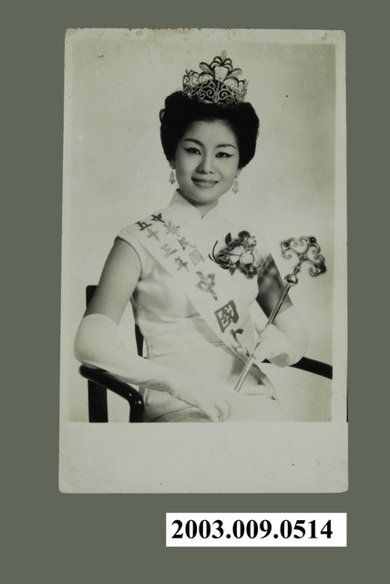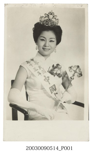 中華民國53年「中國小姐」于儀的黑白個人照,照片上是一位奪冠佳麗,她的肩上披有「中華民國53年中國小姐」字樣的彩帶。