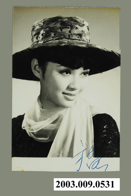 香港女明星方盈的黑白時裝照,上有其簽名。