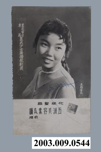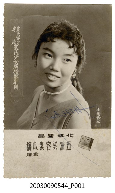 五洲美容素本舖發贈歌仔戲演員素蓮的黑白時裝廣告照,為素蓮於農民電台(今正聲臺中台)農民少女廣播歌劇團時期的影像。照片上有「農民電台專屬、農民少女廣播歌劇團」、「主角苦旦」等字樣,以及「素蓮」親筆簽名;而照片下方則是「化妝聖品、五洲美容素本舖敬贈」廣告文字。