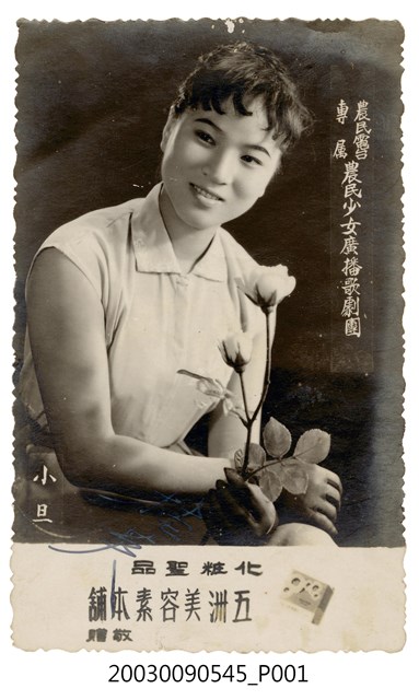 五洲美容素本舖發贈歌仔戲演員桂英的黑白時裝廣告照,為桂英於農民電台(今正聲臺中台)農民少女廣播歌劇團時期的影像。照片上有「農民電台專屬、農民少女廣播歌劇團」、「小旦」等字樣,以及「桂英」親筆簽名;而照片下方則是「化妝聖品、五洲美容素本舖敬贈」廣告文字。