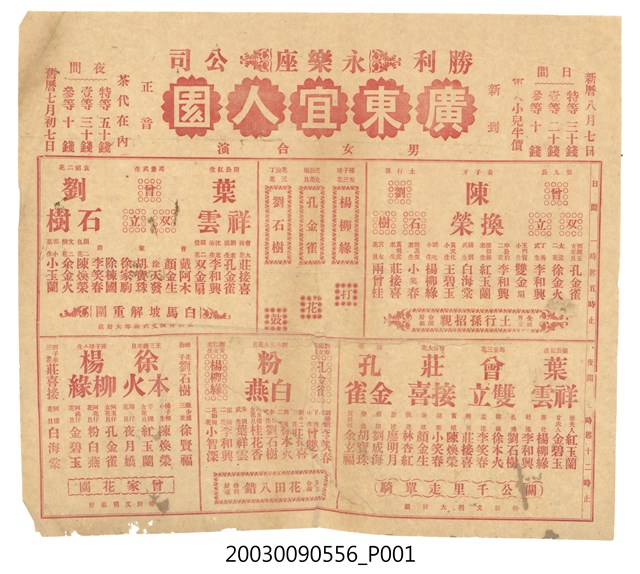1.本物件為勝利公司廣東宜人園於永樂座戲單,其為紙質,紅色印刷,正上方標題為「勝利公司」、「永樂座」、「廣東宜人園」、「男女合演」,右側註記時間為新曆8月7日,日間場次票價以及軍人孩童半價;最左側則註記夜間場次為舊曆7月初7,分三種票價且茶費算在內。戲單上半部為日間場次,且為「一時起五時止」,分別列出三場戲〈土行孫招親〉、〈打花鼓〉、〈白馬坡解重圍〉之演員及飾演角色名稱;下半部為夜間場次,為「七時起十二時止」,三場戲分別為〈關公千里走單騎〉、〈花田八錯〉、〈曾家花園〉,亦列出演員及飾演角色名稱,戲單多有註記「特別文明」、「好戲」等字。