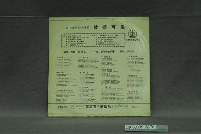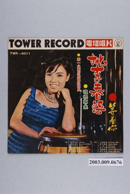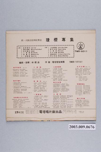 電塔出品編號「TWR-6011」,「瓊櫻專集:桃李春怨」12吋唱片封套。林禮涵編曲、指揮,電塔管弦樂團伴奏,瓊櫻演唱。 封套正面為專輯歌手瓊櫻獨照。背面為〈桃李春怨〉、〈等著你〉等12首歌曲歌詞,定價40元。